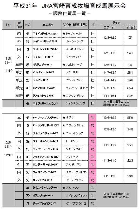 上場予定馬には、タイムフライヤー(G1-ホープフルS)の半妹「No.32-タイムトラベリングの17(父フェノーメノ)」、フクノドリーム(G3-エーデルワイス賞)の半弟「No.14-キャニオンリリーの17(父キンシャサノキセキ)」、コスモネモシン(G3-新潟記念,G3-フェアリーS)の半弟「No.25-デュプレの17(父ゼンノロブロイ)」、イッツクール(OP-ききょうS)の全弟「No.1-タキオンメーカーの17(父アルデバラン2)」など計80頭がラインアップされています。