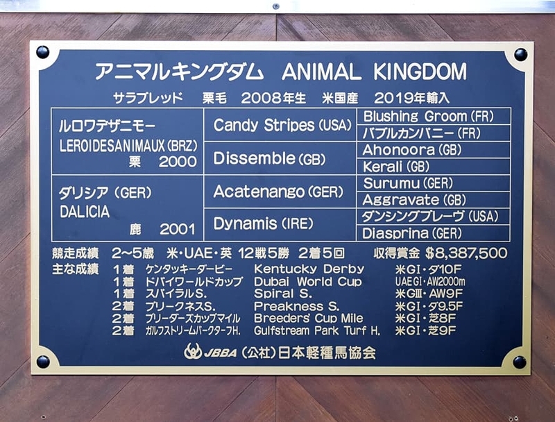 アニマルキングダム(Animal Kingdom)は、父Leroidesanimaux(BRZ,2005年度米芝牡馬チャンピオン)、母ダリシア(GER,独G3フィナンツグルペ賞,サトノキングダム・サトノメサイア・サトノダムゼルの母)、母父Acatenango(GER)という血統の11歳牡馬。